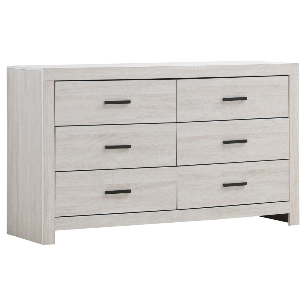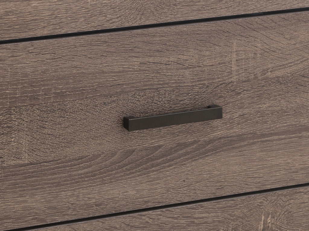 The Brantford bedroom set blends modern style with practical storage. Anchored by a platform bed with a slatted headboard, this set offers both form and function. Two spacious footboard drawers provide extra storage for linens, clothing, or accessories. Crafted from engineered wood with a durable laminate veneer, each piece is built for longevity. Matte dark bronze hardware adds a stylish contrast, enhancing the contemporary appeal. Designed for convenience, the mattress-ready platform bed eliminates the need for a box spring.
